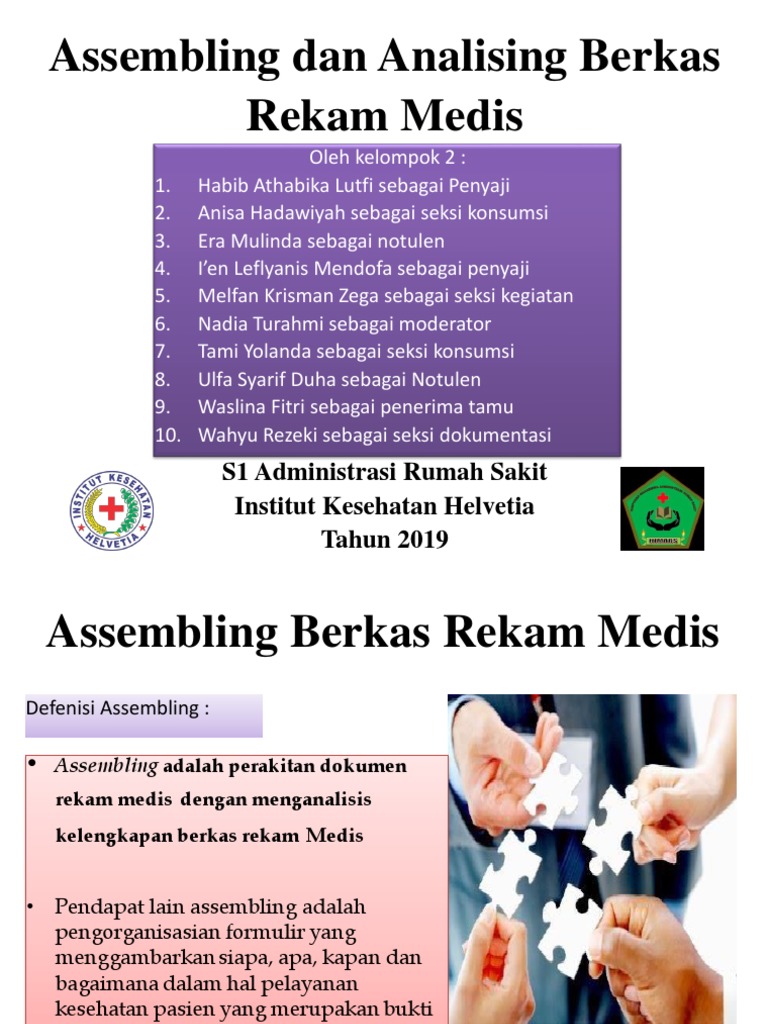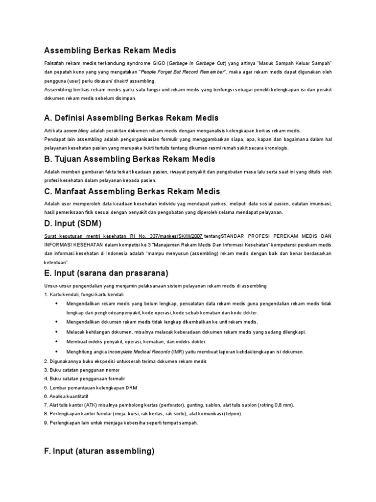 Assembling rekam medis adalah. PENGERTIAN SISTEM PENOMORAN Salah satu sistem dari penyelenggaraan RM dimana semua pasien yg datang ke instansi pelayanan kesehatan diberikan suatu nomor Rekam Medis NoRM yg berfungsi sebagai salah satu identitas pasien. Bagian assembling yaitu salah satu bagian di unit rekam medis. Sistem Penyimpanan Pengertian Penyimpanan Penyimpanan adalah kegiatan menyimpan penataan atau penyimpanan berkas rekam medis untuk mempermudah pengambilan kembali.